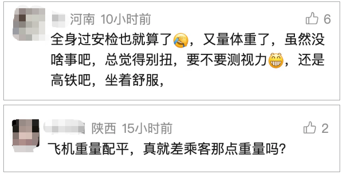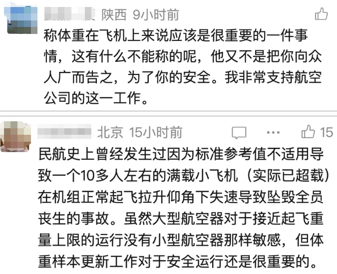 评论区中有网友表示,比较介意被他人看到自己的体重,能否选择不称重?对于称体重是否遵循自愿原则,国航客服表示需查询后答复,发帖网友则回复称,“机场人员会询问,每个人都是自愿称重的,还给了小礼物。”