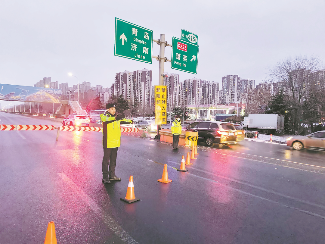 2月2日,高速福山大队民警辅警在沈海高速公路引导分流车辆。方毅 摄